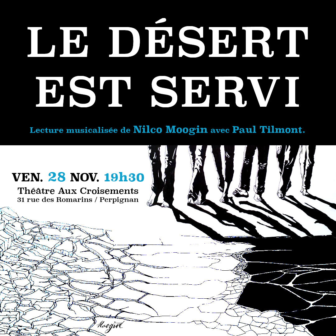 LE DESERT EST SERVI Posted at h in Concerts, Musique by 0 Comments Ven. 28 nov. 19h30 Théâtre Aux Croisements 31 rue des Romarins / Perpignan Lecture musicalisée de Nilco Moogin avec Paul Tilmont. Suivie de « Je suis tigre » de la Cie Groupe Noces. Infos et réservations ici ! Tags: ledésertestservi, moogin, nagpiperproduction, nilco, paultilmont, perpignan, tac, théâtreauxcroisements